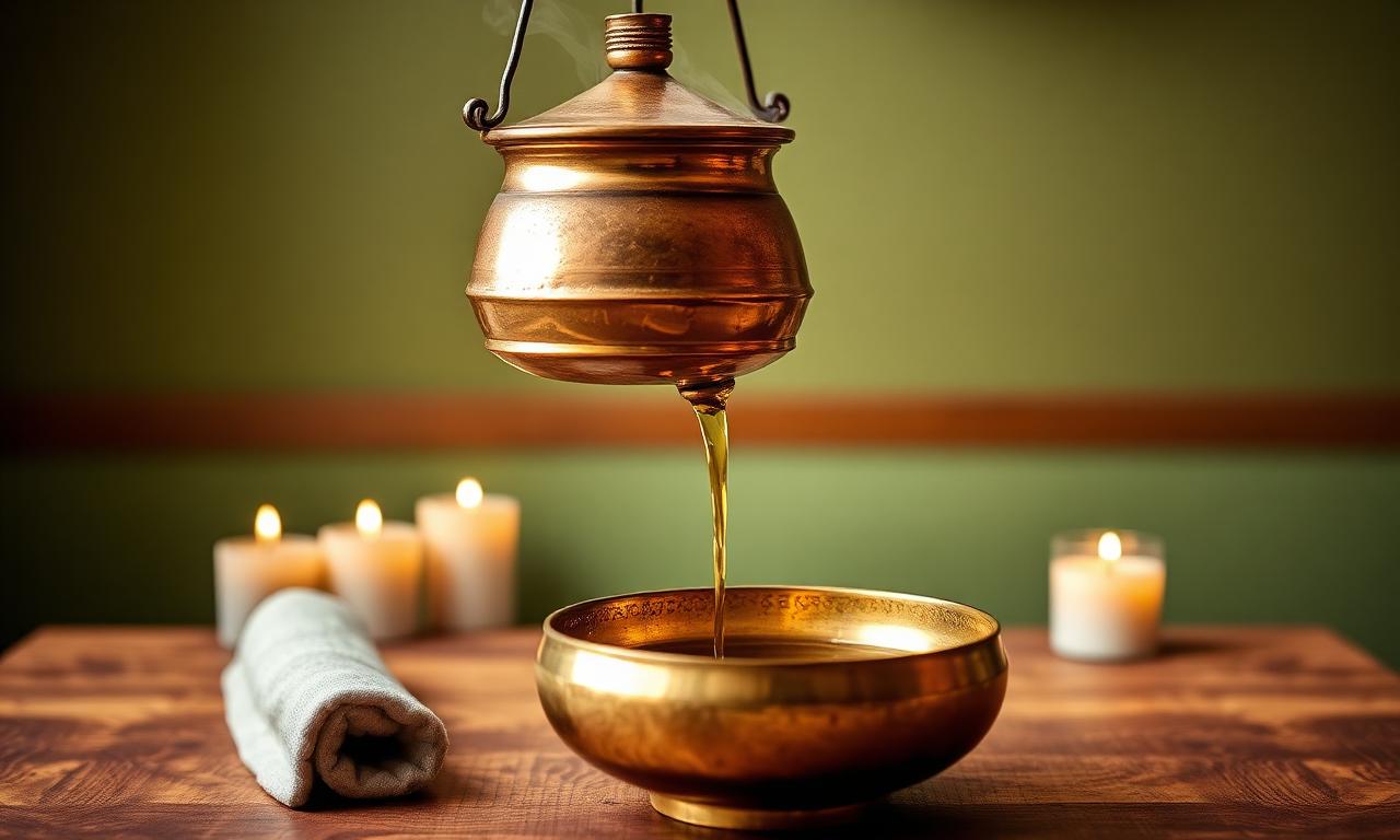 Warm herbal oil stream poured rhythmically over the forehead — calms the mind and treats neurological issues.